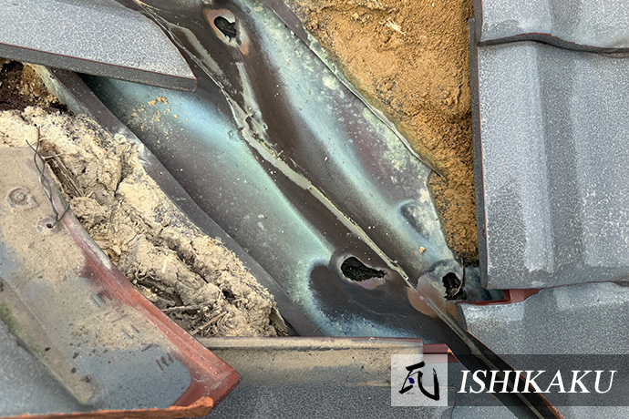 銅板製の谷板はこのように腐食し穴が空いてしまうケースが良く見られます。