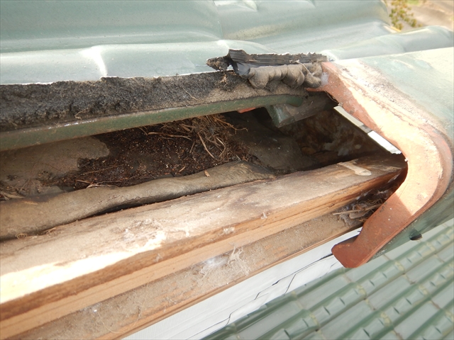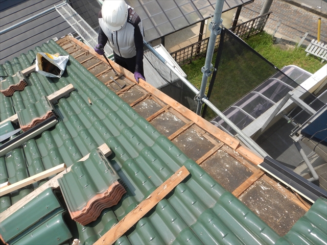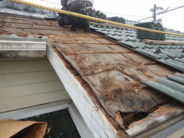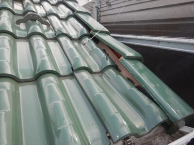 美濃加茂市にて脱落した瓦の復旧作業を行いました。長年の漏水により袖瓦の下地木材が腐食し、固定釘の保持力が無くなってしまった事で瓦が脱落してしまいました。また、運悪く脱落した瓦がお隣の車に直撃し車を破損させてしまいました。今回の補修工事では袖内部に漏水した場合にも雨水が軒先まで流れるように水切り鈑金を取り付け、下地木材を取り換えた後にステンレスネジで袖瓦1本1本固定を行いました。このような瓦の脱落も定期的な屋根点検を行う事で防ぐことが可能となります。