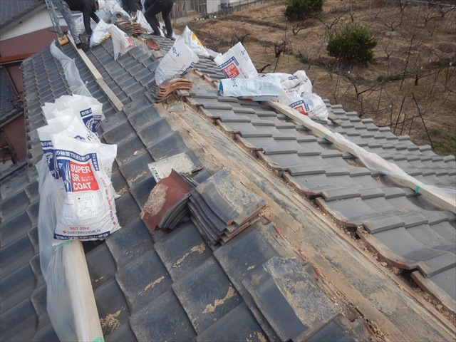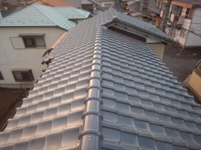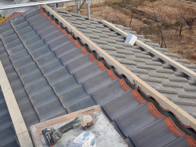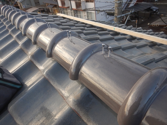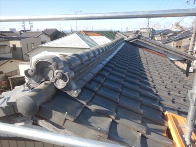 犬山市内にて棟部の交換工事を行いました。のし積みされた棟部を撤去処分し、棟金具を取り付け棟下地を作ります。その際に棟下の瓦を取り換え棟下の隙間を最小限に整えます。その後、金属製の棟ロールを取り付けた後に冠瓦をステンレスネジで固定し取り換え完了です。棟部を取り換えることで棟部の耐震力強化と軽量化が期待できます。更に、室内の緩んだ天井を張替えることで室内環境を整えることができました。